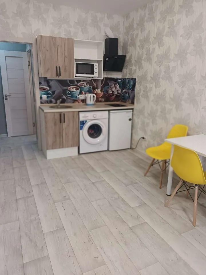 Студия новая, только закончили ремонт, установку мебели и бытовой техники. Рядом распологается вся необходимая инфраструктура. До метро две остановки.